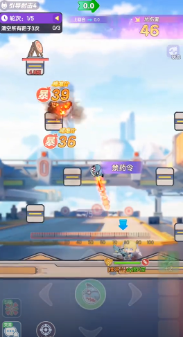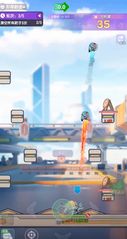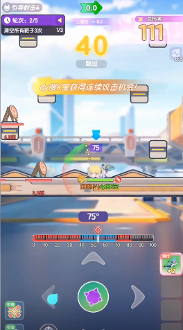 第一轮:这里就是常规,没有地形障碍。初始阶段路面是平坦的,没有明显的坡度或者是障碍,因此就需要迅速地完成掉头以及推进的动作。需要将发射的角度直接调整到一个最大的角度,不需要逐步的调整,以免浪费回合的时间。力度条可以稳定在80左右,误差可以控制在±2以内,如果过强,那么很有可能就会超出目标区域。而如果比较弱,就可能会导致没有办法完成掉头推进。不过最大的角度配合80度就能有效实现角色调头转向。