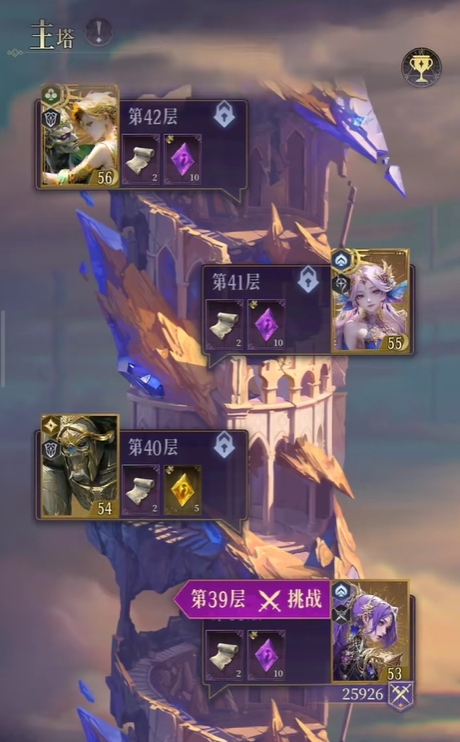 不朽箴言里的爬塔即为参与通天塔挑战,当各位解锁旷野内容后,就能在旷野界面里找到通天塔选项,点进去便可参与它。通天塔每一层都有怪物镇守,难度由低至高,且每隔十层都会有非常明显的难度提升。同时,各位在完成当前层数的挑战后,便能看到下一关怪物战力信息,方便玩家去判断自己是否打得过去。每过一层玩家都能拿到该层的奖励,其中尾数为5、0的塔层会给玩家金品碎片,集齐足够数额能合成金品角色,但能得什么角色十分随机,无法指定,其它层则是会给紫品碎片,能随机开出紫品角色。