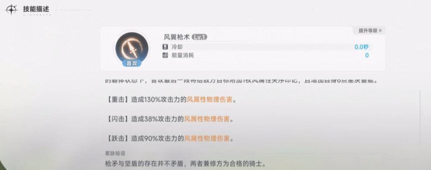 风翼枪术是莉莉的普攻技能,还技能能够连续对敌人进行5段普攻攻击,可以造成394%的风属性物理伤害,莉莉若是在霸体状态下使用该技能的话,在最后一击时还能给敌人附加上风属性的失序印记,同时能给自身增加6点的星决蓄能。