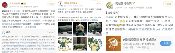 花呗文物皮肤上新,引发网友热烈讨论,纷纷表示要换皮肤接好运,把“老宝贝”们捧在手心里。湖南、广东、江西等省的多家博物馆也在线@花呗,争相推荐宝贝,花式催更,希望自家宝贝的皮肤也能尽快上线。