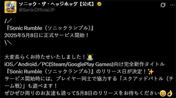 游戏玩法灵感源自《糖豆人:终极淘汰赛》,玩家将扮演索尼克系列中的角色,在一个由蛋头博士创造的充满奇趣机关和陷阱的竞技场中展开激烈的对抗。目前,《索尼克大乱斗》已在44个国家和地区率先发布,不久后将面向全球的安卓、iOS和Steam玩家推出。