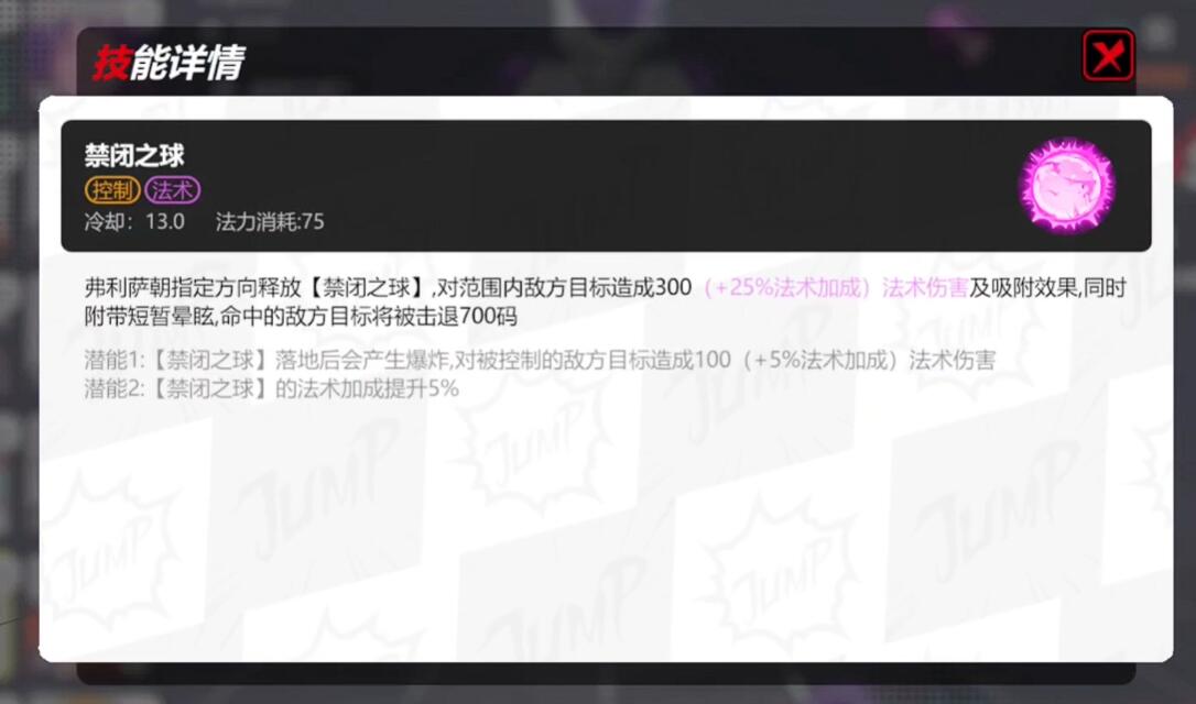 二技能“禁闭之球”定位控制型技能,冷却13秒,消耗75法力。释放后向指定方向生成黑洞球体,对范围内敌人造成300(+25%法术加成)法术伤害,同时产生吸附效果与短暂僵直(约0.5秒),命中目标将被击退700码(相当于屏幕1/3宽度)。潜能1强化为“落地爆炸”,对被控制的目标追加100(+5%法术加成)伤害;潜能2提升5%基础法术加成。实战中多用于先手开团,通过吸附将分散敌人聚堆,衔接后续AOE技能打范围伤害,击退效果可打断敌方施法前摇(如敌人释放大招时)或阻止近战突进(如敌方刺客切入时),配合队友集火能快速压低敌方血线,是构建控制链的核心技能。