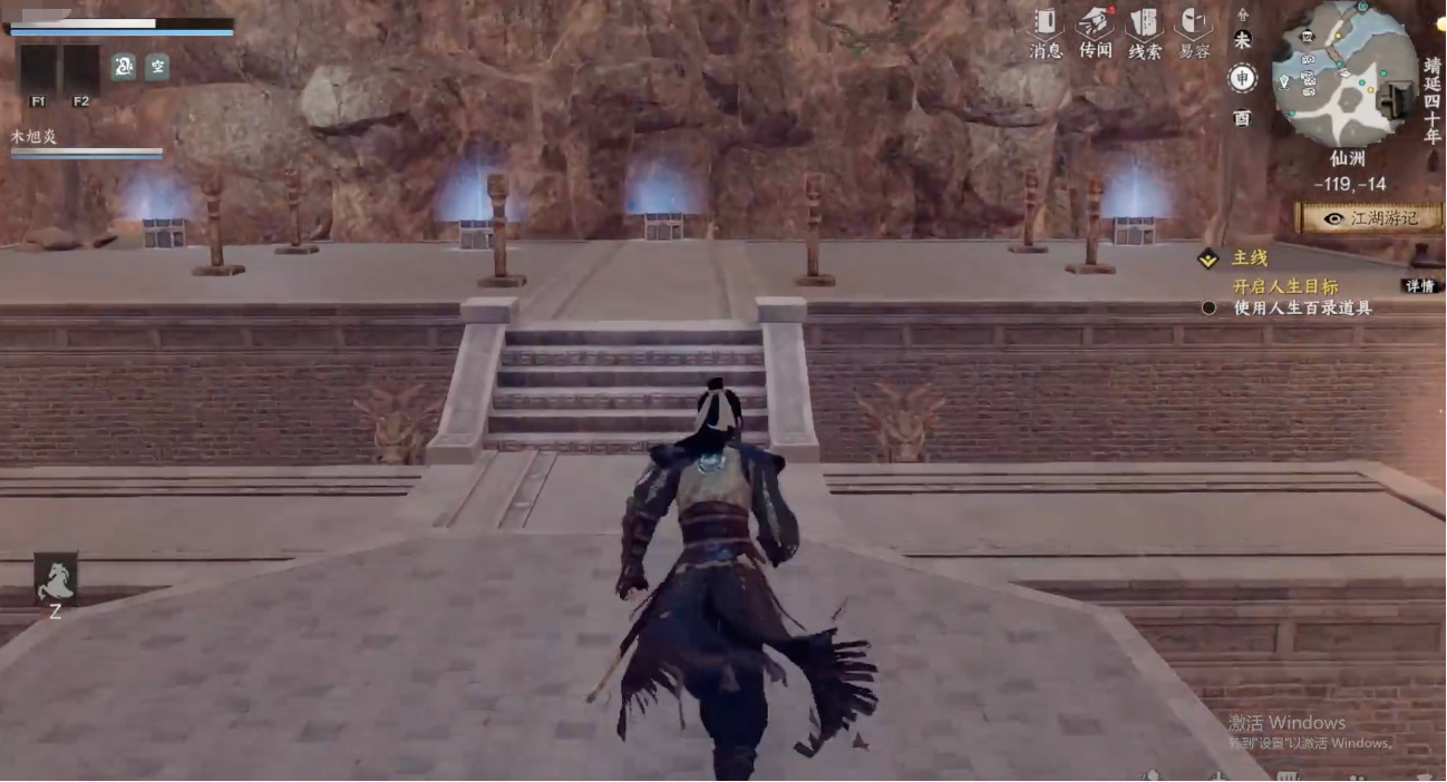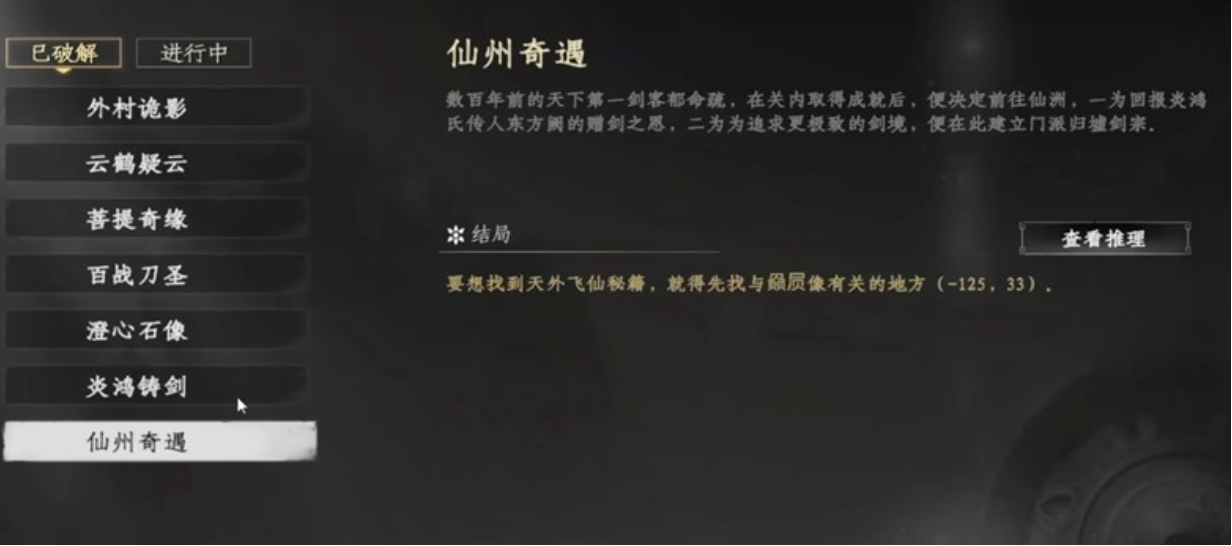 进入仙州地宫有两个解密环节,而且村长身上虽有地宫钥匙,但并非必需,因为仙州有个宝箱里也有能开地宫的钥匙。先说第一个解密“炎鸿铸剑”,到云潇山庄触发金鳞客事件,拿到“琉薪岩”后找铁匠铺老板,拿到关键一个证词。之后在小镇里多和NPC互动互动,一共要收集四个证词。再到云潇山庄山上(可在地图检索NPC),靠近燕某会触发抢夺琉薪岩的剧情,需要把他打败,能得到一把郁命疏的宝剑。