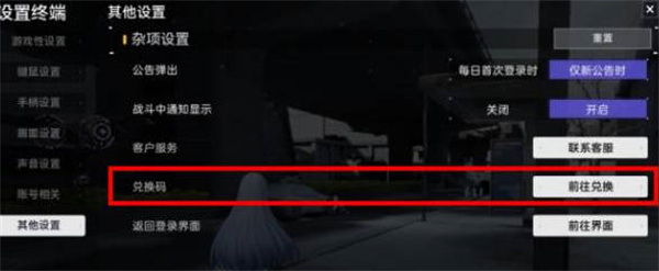 2:然后我们在设置的页面中,找到其它设置的选项,接着哦我们找到右侧的兑换码;