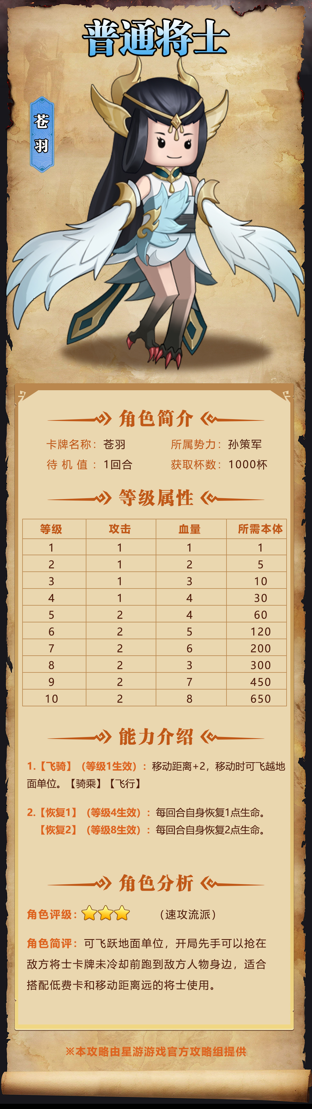 角色简评:可飞跃地面单位,开局先手可以抢在敌方将士卡牌未冷却前跑到敌方人物身边,适合搭配低费卡和移动距离远的将士使用。