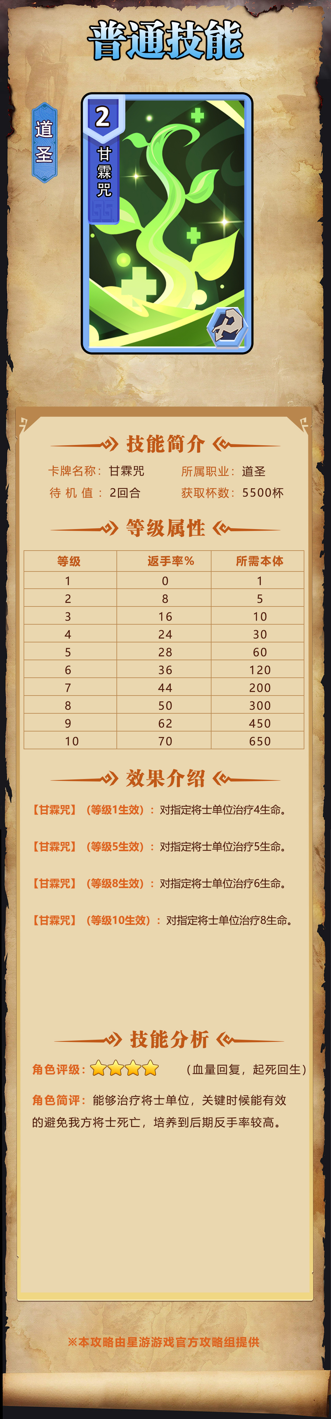 角色简评:能够治疗将士单位,关键时候能有效的避免我方将士死亡,培养到后期反手率较高。
