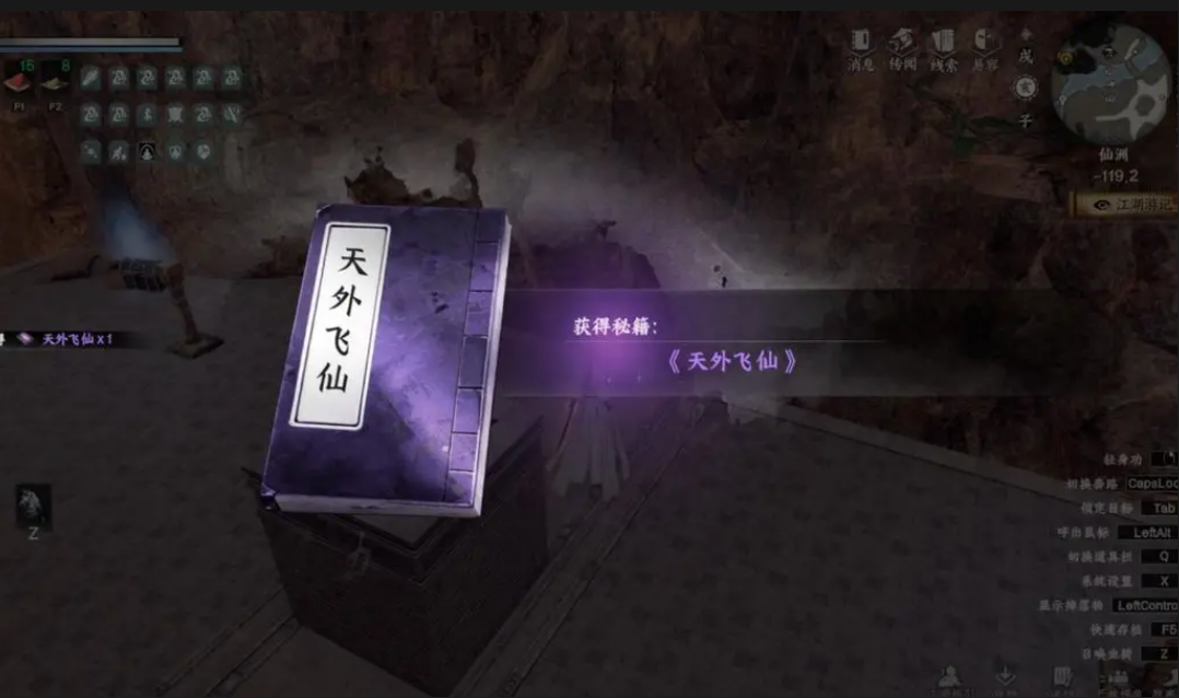 先别急着去地宫,要先收集道具。来到(-68.-50)开启宝箱获得仙洲地宫钥匙,接着向前(-124.-63)击败燕行舟获得石质剑牌一,再前方树下(-75.14)击败太监获得石质剑牌二。道具收集齐后,就可以去地宫探索了。玩家来到赑屃像的地方可以触发(-125.33)交互开启,最里层交互左、右石像,宝箱就会出现,开启宝箱就能获得剑法秘籍天外飞仙。
