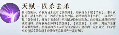安期的天赋技能“以杀去杀”,一开始听起来有点吓人,但实际上它为她带来了极大的灵活性。每次使用技能,如果场上没有“黄金剑”,她就会获得若干层“刍狗”。这些“刍狗”看似是负担,但实际上,它们能在累计到一定层数后被清除,并转化为“黄金剑”,这些剑会平均分配给剩余的队友。最关键的一点是,若安期自身死亡或以其他方式离场,全队的“黄金剑”都会被消除,给敌人带来不小的威胁。