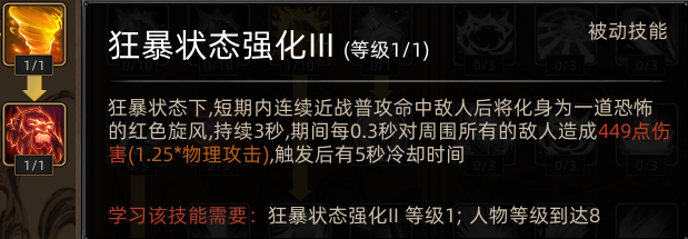 我们把狂暴状态点到两三级就差不多了,强化1如果不跨级打怪只需要点1级,抓紧点狂暴状态强化2和3.效果分别是免疫被击打硬直和高伤害大风车。
