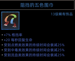 我们还可以选择这个五色围巾,中毒流血点燃三个效果都有抵抗,还有每秒生命恢复。可以在古老秘仪之窟刷到。