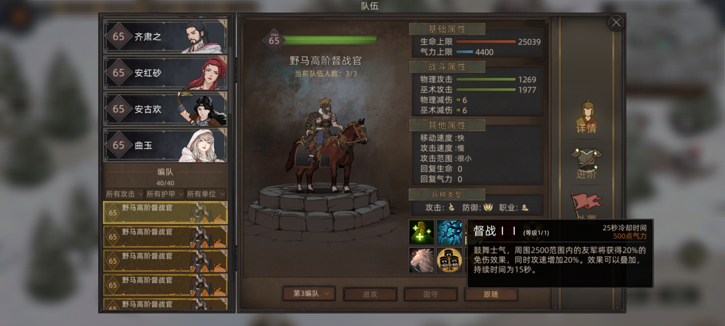 大约有8~10队奶骑,就可以放弃其他前排,只需要几个嘲讽队友,再加上安谷欢群体抬血,就可以应对绝大多数场面。特别注意火魔恐惧骑的冲阵,在推火魔的时候,对面火魔骑超过20队时,建议还是换树人前排,不然很容易被冲散。