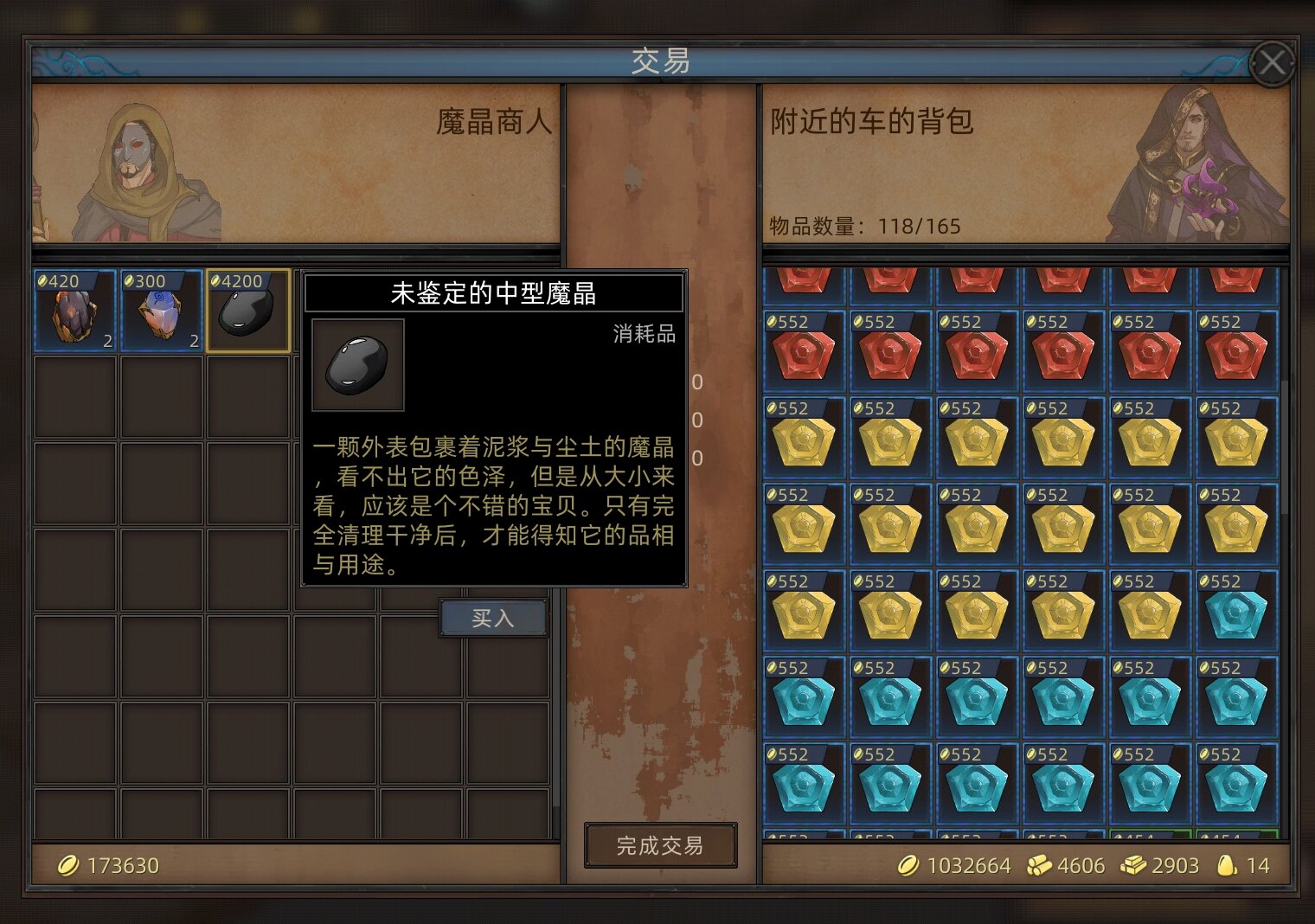 未鉴定的魔晶也就是宝石 我一般只要中型(有两种,从售卖价格上有差异 名称却是一样的)和大型,大型魔晶较难获得 。