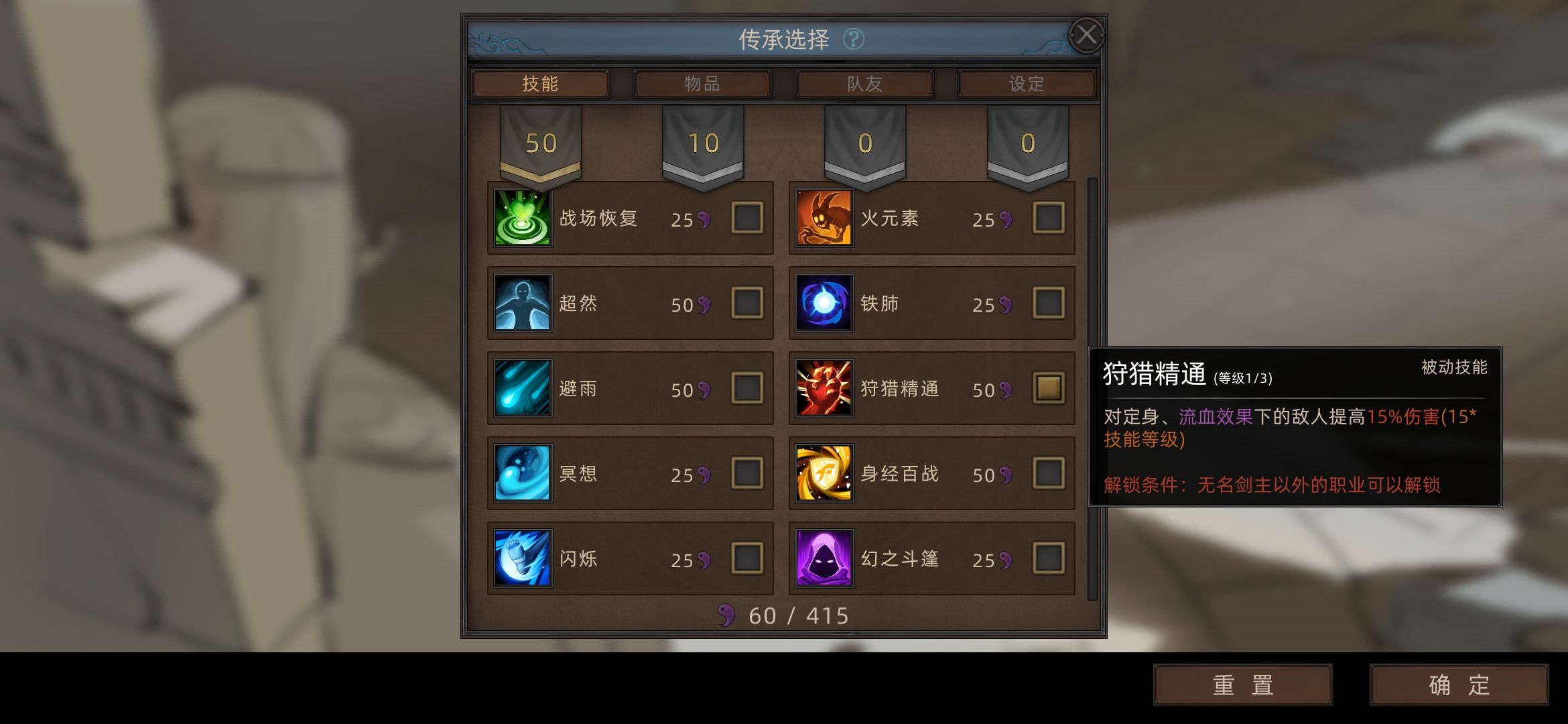 开局60传承点(要是速通主线就带着,要往后拖到500天后的话,狩猎精通换成遁入阴影+雾遁)遁入阴影升3.雾遁升1就行