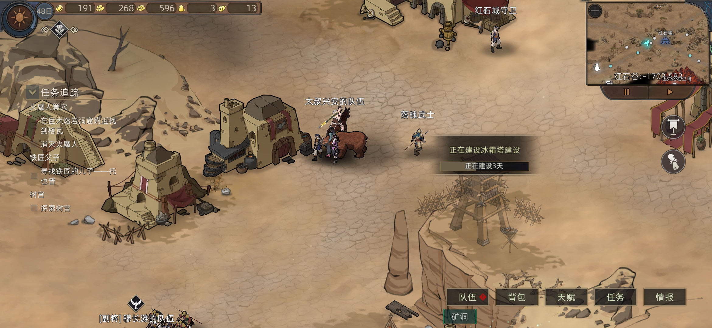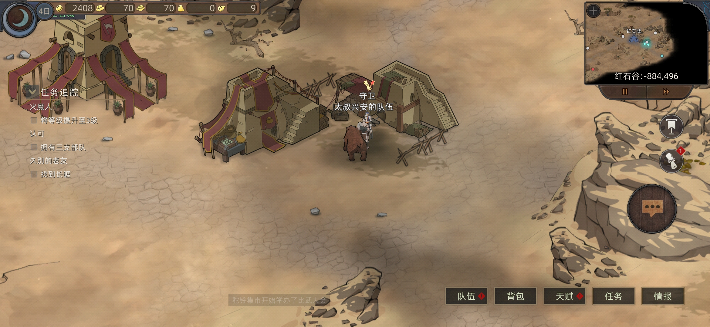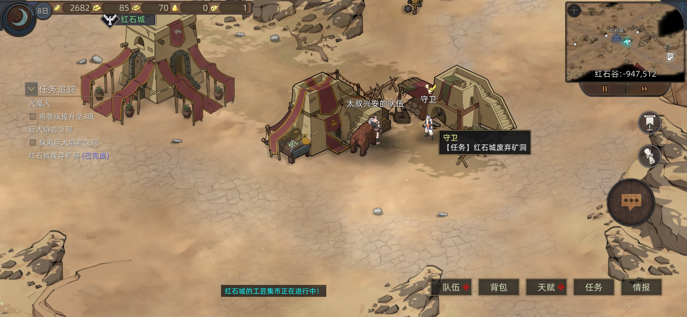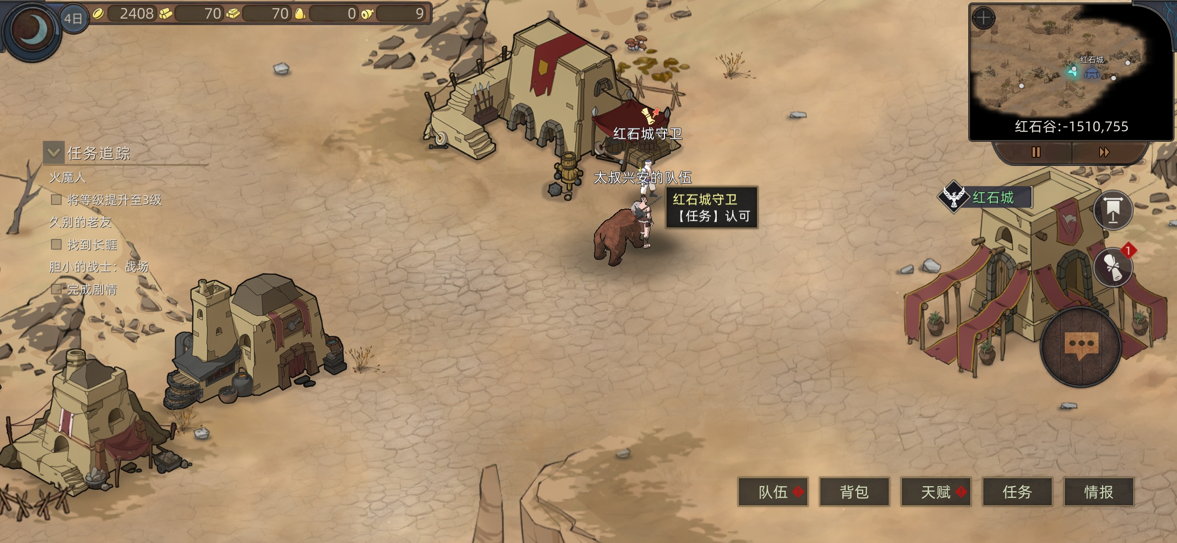 红石城左右两个任务,进入红石城,进下酒馆(有人之后可以在情报里看所在位置)