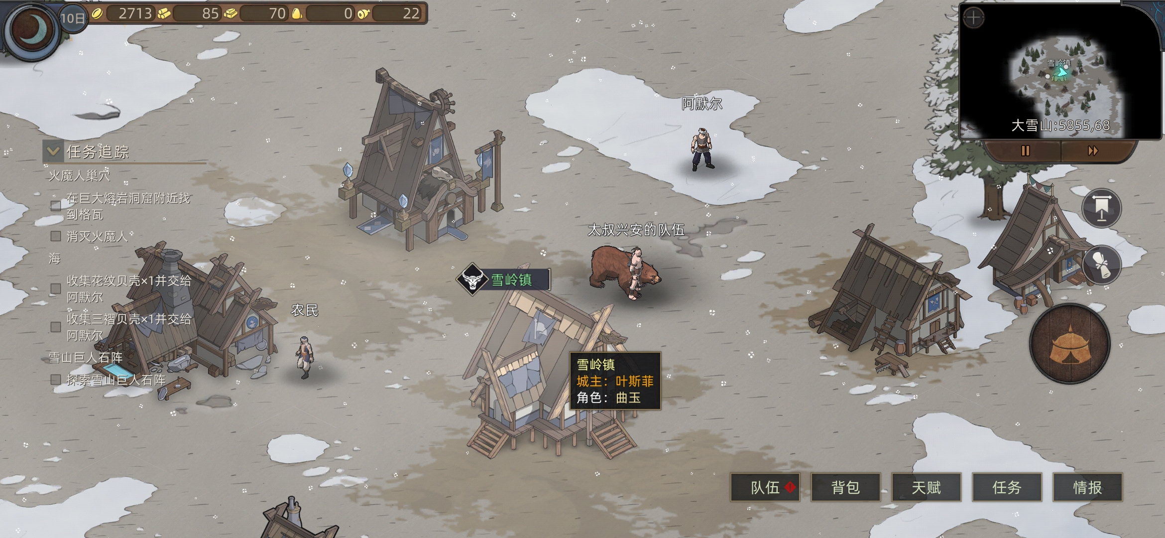 途径雪岭镇,进入城中,进入酒馆(曲玉刚巧在,但是没法招,对下话,方便后面追踪),接俩任务继续前行