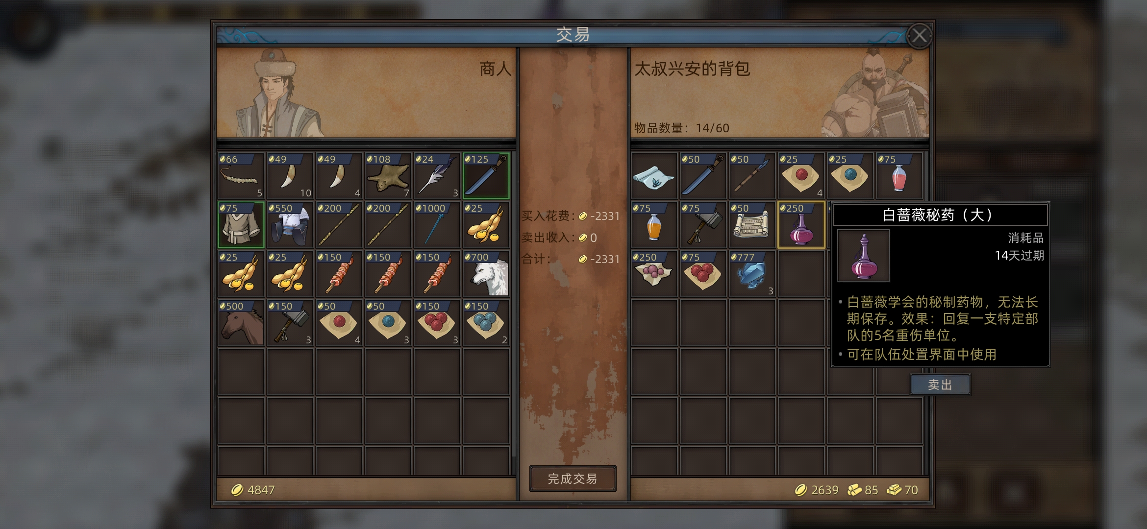 卖掉钻石(最好三个能卖四千,不知道他这个咋给的),蔷薇秘药卖掉(其他的秘药不要卖,有用)