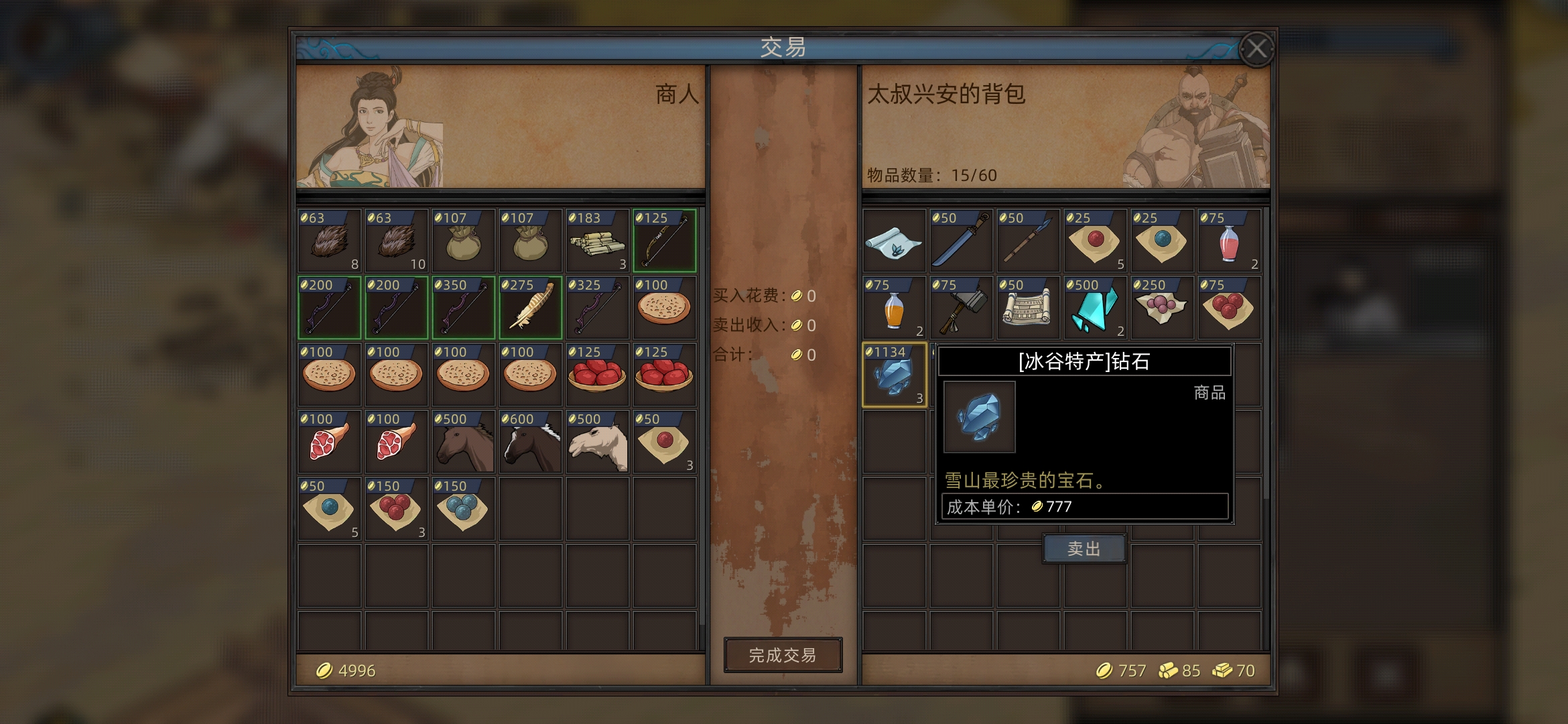 到冰谷,进城买东西,(买临时啥资格一百来乌塔),买入钻石卖出蔷薇秘药(狼皮也顺带买一下,我又忘了)要留一百乌塔购买临时通商!!!
