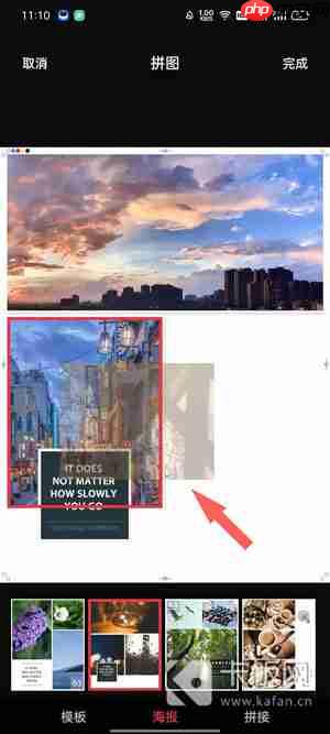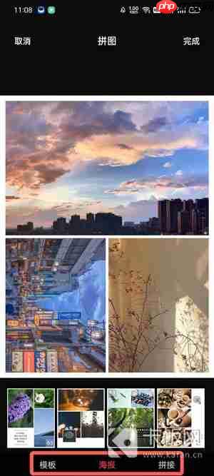 - 进入拼图界面后,你可以从下方选择【模板】、【海报】或【拼接】等选项,挑选适合的样式进行拼图。