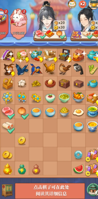 在《梦幻消除战》中,玩家需通过交换相邻的物品来完成三消任务,例如玉佩、竹简等图块,达成横向或纵向三个及以上相同物品连成一线即可触发消除效果。每种道具具备独特功能,比如面点类物品被消除后,可能恢复角色体力,或是解锁茶楼中的隐藏菜谱,为后续经营提供支持。