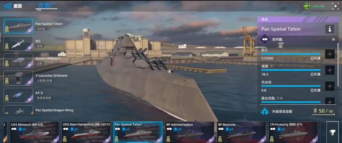 提顿的反舰核心是锆石导弹,其超高速度可压缩敌方反应时间。发射时建议分批齐射(2-4发一组),避免被一次性拦截。对陆攻击则依赖战斧导弹,适合远程消耗敌方据点或航母。若敌方防空密集,可先使用MQ骗一下诱导,再发射主力导弹,主炮在近距离交战时可用于补刀,尤其针对残血驱逐舰或潜艇。提顿的机动性优于多数巡洋舰,但转向半径较大,需避免陷入近身缠斗。交战时保持中距离(8-12km)游走,利用地形遮挡敌方视野。若遭遇潜艇伏击,立即加速变向并释放反潜深弹。