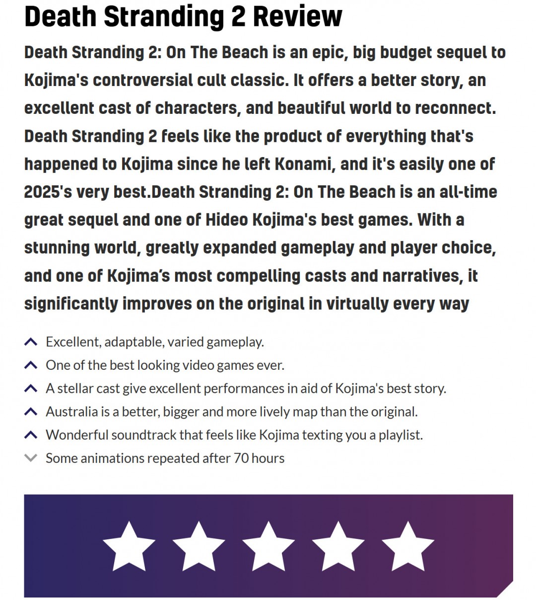 时间:2025-06-24 | 作者: | 阅读:0《死亡搁浅2》媒体评分出炉,不少媒体(VGC、Push Square、Dexerto等)给出了满分10分评价,而IGN、GameSpot分别打出9分和7分。
