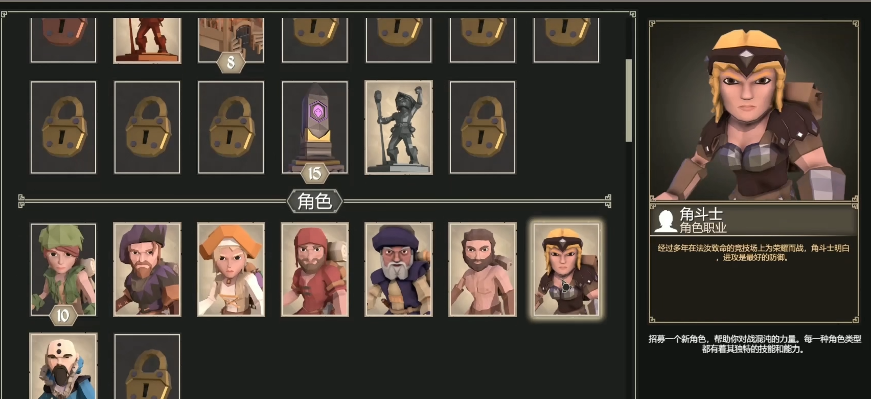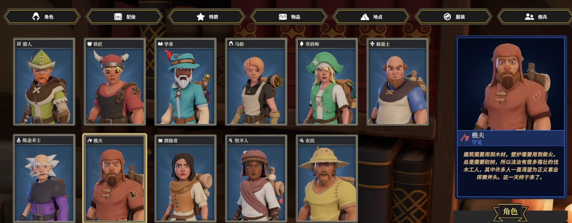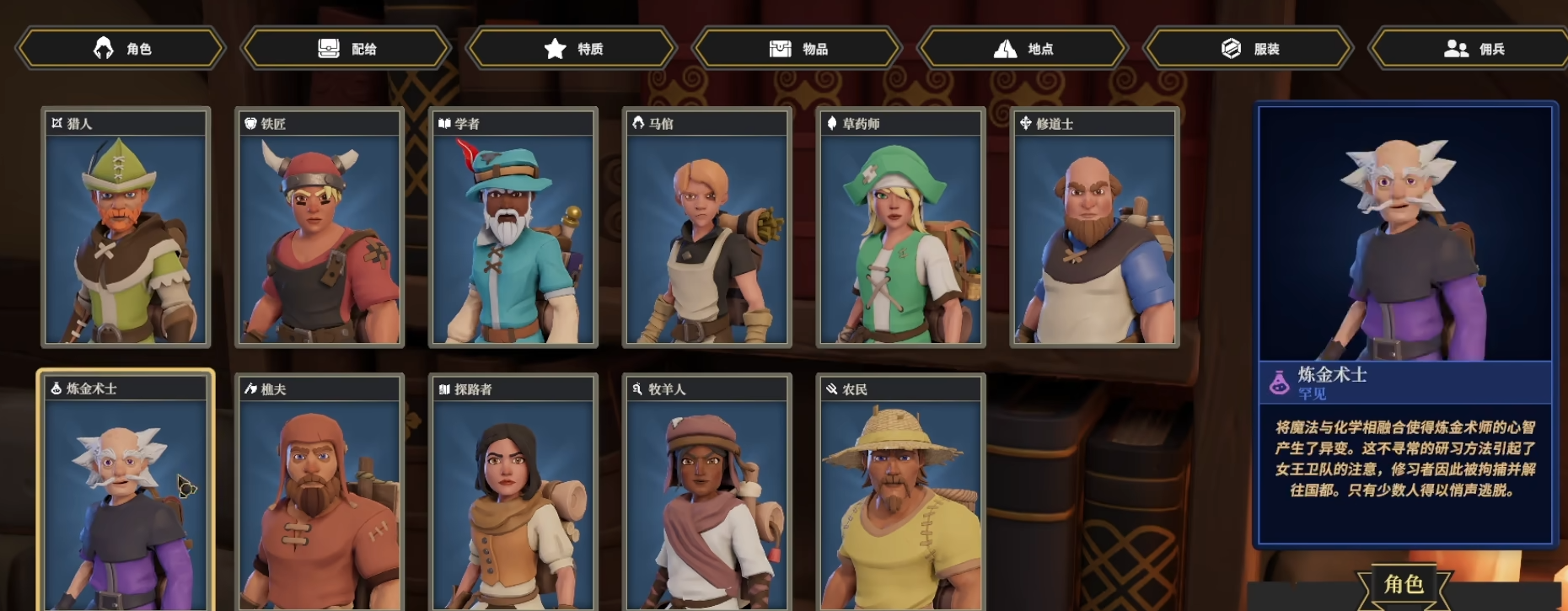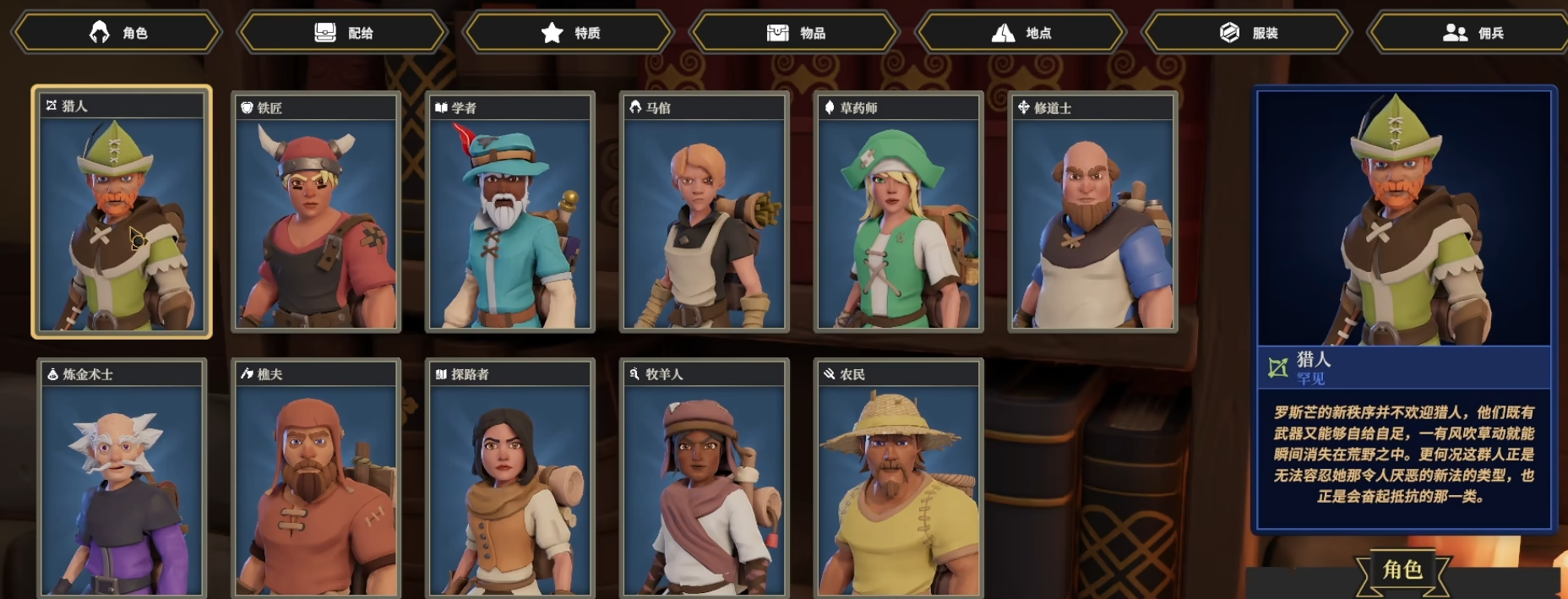 在特定阵容或玩法中能发挥独特价值,但泛用性稍逊。黑帽是控制型角色的代表,高意识与高速度使其擅长用毒药、陷阱等技能对敌人进行削弱,混乱与偷窃技能在PVE中作用显著。农民拥有与樵夫相近的武器池与属性,但速度略低,其被动技能可建造稻草人保护后排,在对抗穿刺攻击时效果有限。设陷者兼具辅助与输出能力,敏捷和意识属性仅次于猎人,天赋技能含金量高,但基础属性相对弱势。