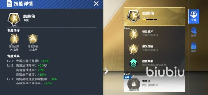 米切尔专属技为“蜘蛛侠”,这在一级的时候就可以解锁爆发突破动作,以及“惊世战斧”扣篮动作,并且还能提升15%扣篮抗盖帽的几率,保证进攻的成功,在二级的时候会0.5秒高速运球时间、10%出手速度,以及5%运球速率。