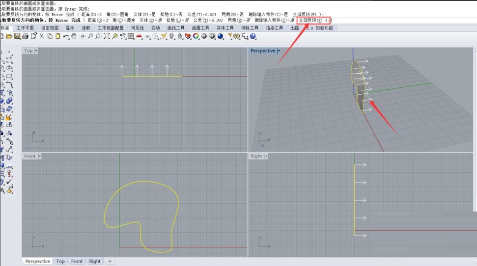 确认之后,我们会发现模型上面有一排白色的小箭头,那个箭头表示我们偏移曲面的方向。若你想要的不是系统设定的那个方向,可以点击下图中红色箭头引导的“全部反转”区域,就可更改成相反的方向