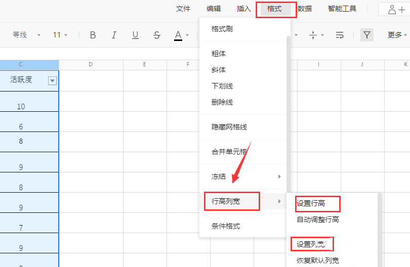 7、也可以选中需要设置的数据区域后,点击“格式-行高列宽”,选中“设置行高/设置列宽”,设置对应行高或列宽即可