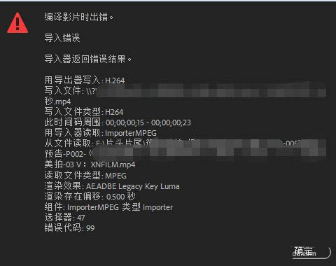 此时如果弹出这个界面,显示错误代码99,表示视频源文件有问题,所以我们去替换一下原素材