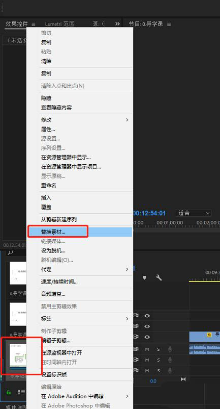然后在pr中对素材视频鼠标右键,选择【替换素材】