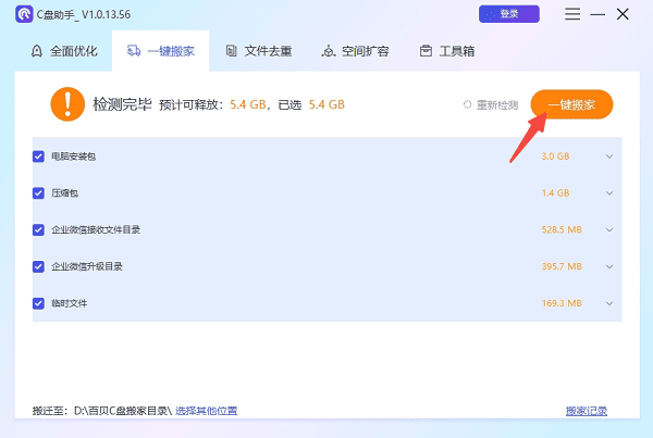 3、此外,如果你需要将大型文件或安装包转移到其他磁盘,可进入“一键搬家”界面轻松操作,释放更多C盘空间。