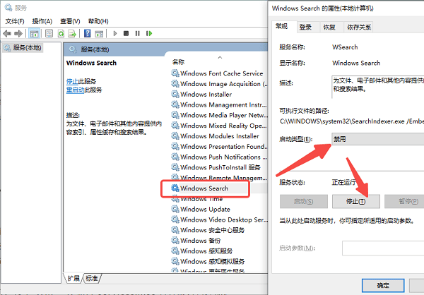 3、双击后将“启动类型”设置为“禁用”,并点击“停止”按钮。