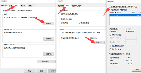 1、打开电脑设置,进入“系统”>“关于”>“高级系统设置”>“性能”>“设置”>“高级”>“更改”。