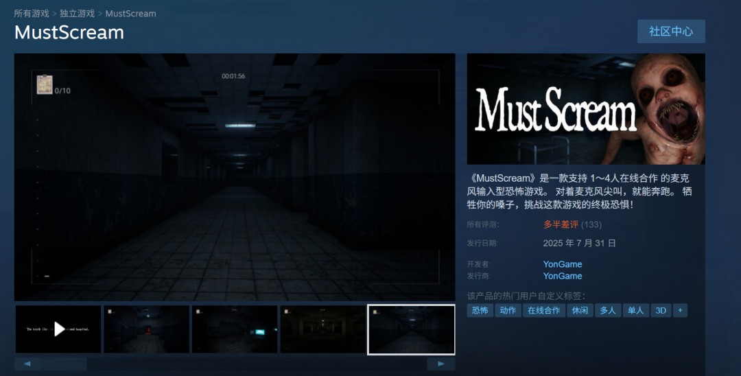 时间:2025-08-12 | 作者: | 阅读:0Steam新作《MustScream》是一款支持1~4人在线合作的恐怖游戏,支持简体中文,Steam国区29元。作为一款独立游戏,该作非常创意地引入了“麦克风输入”玩法,正如名字“MustScream(必须尖叫)”所示,在游戏中玩家需要对着麦克风尖叫,就能奔跑,牺牲自己的嗓门,来挑战这款游戏的终极恐惧!