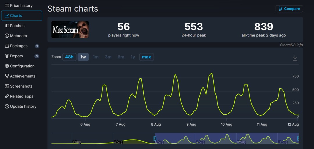 尽管玩法非常有新意,但该作自7月31日发售登陆Steam以来并没有获得太多用户。截至到目前(8月12日),Steam页面仅获得133篇用户评价,好评率仅29%,当前为“多半差评”。SteamDB统计数据显示,《MustScream》同时在线峰值仅839人,尚未突破千人,24小时峰值553人,当前在线56人。