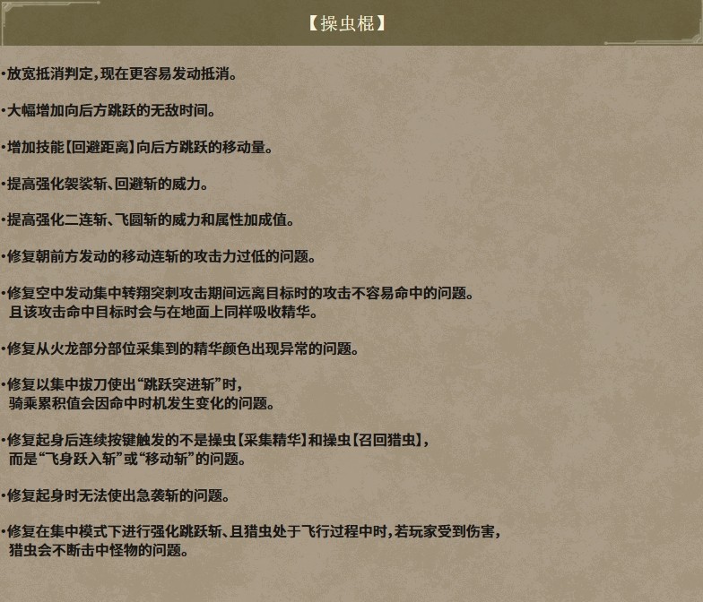 其他值得注意的更新包括一些bug的修复,以及对大剑、操虫棍、长枪等所有武器的平衡调整。以下是一些更新日志内容: