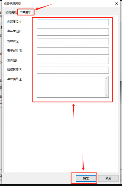 5、如果选择为视频添加更多个人信息,可以在视频信息选项弹窗中的“作者信息”栏目下填写信息,之后再点击“确定”。