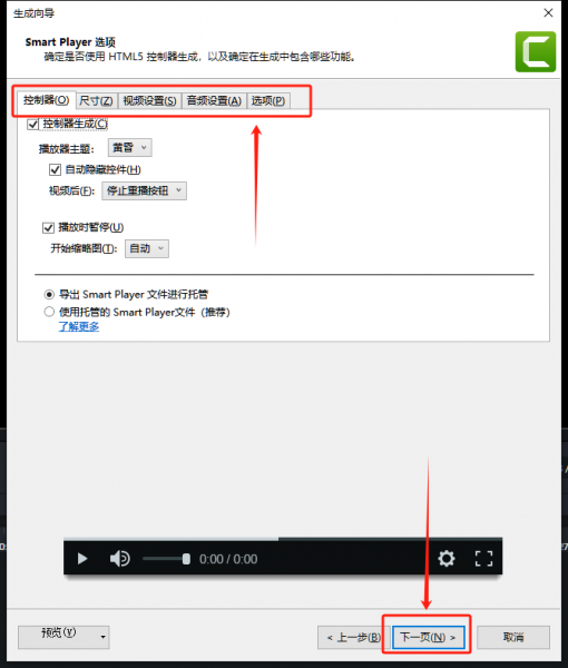 3、在新的生成向导弹窗中,我们可以设置Smart Player选项,包括控制器、尺寸、选项等多种参数,设置完成后点击“下一页”。