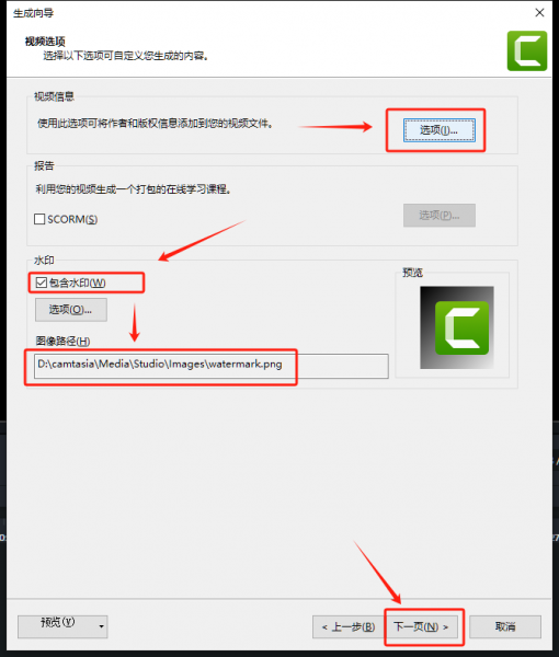 4、如果想为导出视频添加更多个人信息,或更好地维护版权,我们可以点击视频信息后的“选项”按钮,勾选“包含水印”前的方框,选择好图像路径之后点击“下一页”。