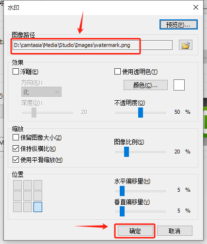 6、视频添加水印时,我们还可以选择水印图片保存位置,也可以设置水印效果、缩放比例以及水印位置,设置好之后,点击“确定”按钮即可。
