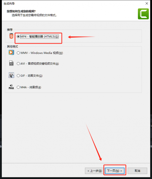 2、在软件的生成向导弹窗中,可以按照需求勾选“MP4-智能播放器”“WMV-Windows Media视频”前的选项,选好之后点击“下一页”。