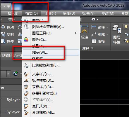 如下图所示,点击标题栏中的格式,点击下拉菜单中的线宽。