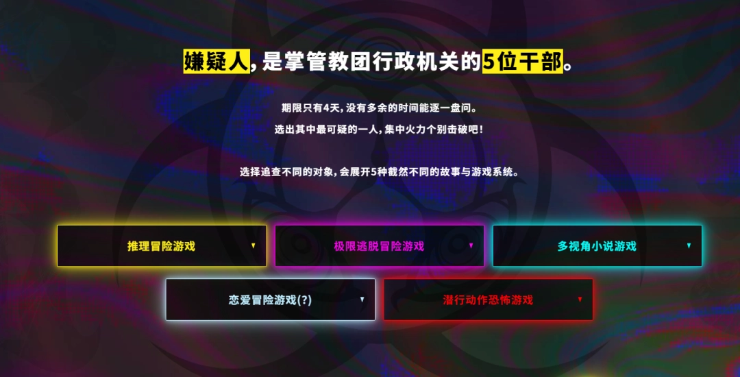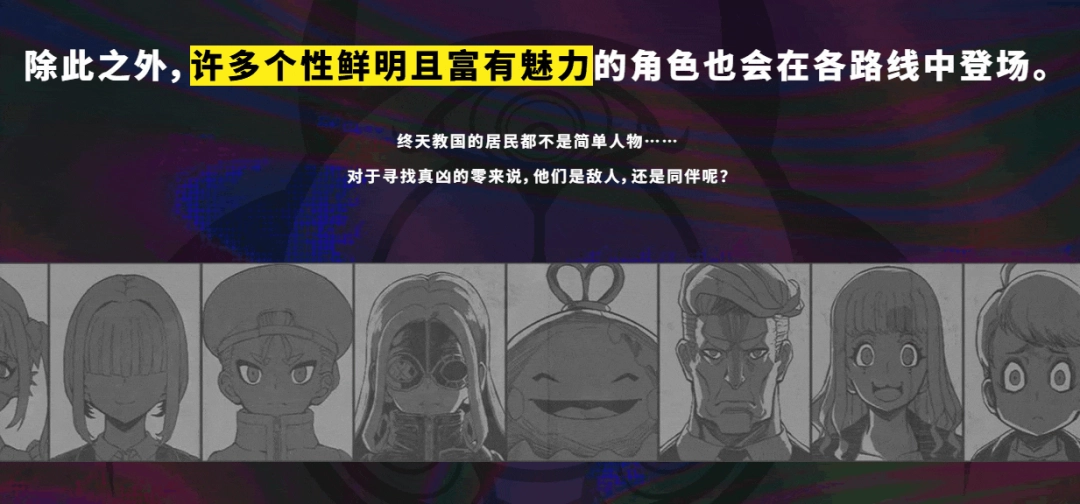 与《弹丸论破》类似,《终天教团》同样有着极其丰富的群像塑造,甚至在此框架下做出了许多突破与创新。游戏为5位嫌疑人干部设置了相对独立的故事线,并且每条路线均配备独特的玩法机制。