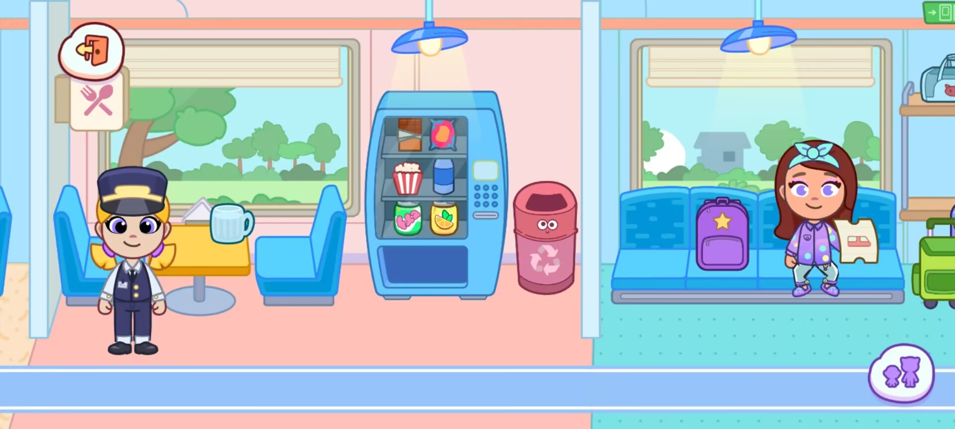 旅途中的社交座位支持 “调整靠背角度”“拉上窗帘”,行李架可 “存放 / 取出行李箱”。用餐区的橱柜提供刀叉、餐盘道具,将 “三明治”“咖啡” 摆上餐桌后,点击角色触发 “用餐对话” 动作(头部转动、手势交流)。垃圾桶可 “丢弃垃圾”(动画显示垃圾消失),培养环保意识。