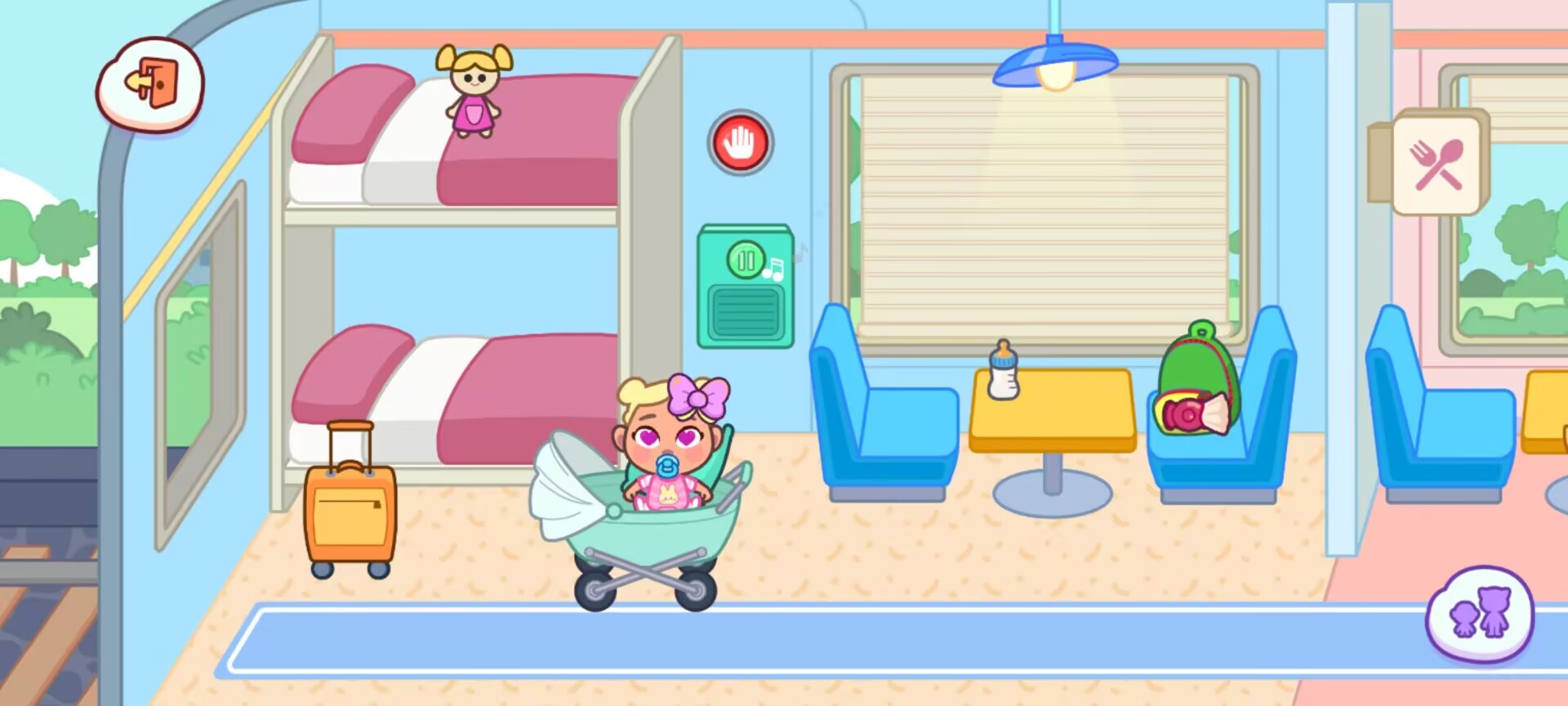 卧铺车厢的夜晚上下铺床位可 “展开被子”“关闭床头灯”,婴儿车支持 “摇晃入睡”(滑动屏幕触发摇摆动画)。紧急按钮点击后会触发 “全车广播” 音效(虚拟语音:“请注意,前方到站……”),适合设计 “深夜紧急停靠” 的突发剧情。