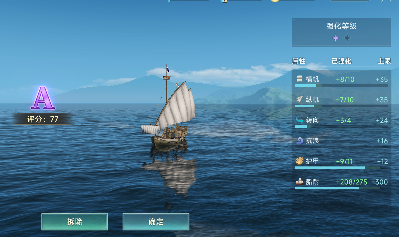 另外排船需要超限强化的属性比较多,有护甲,船耐和浆力3个必须强化的属性,以及转向和帆2个次要属性。