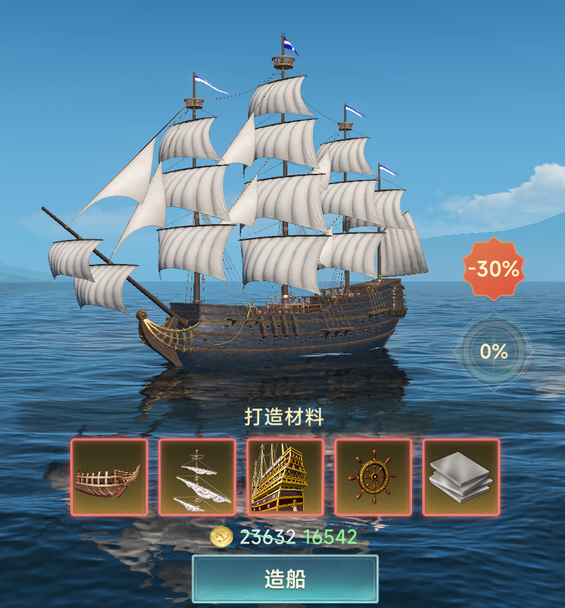 接下来是船只打造折扣,每天有5次的7折优惠造船,而且是包括了全部材料的7折,低级船可能不明显,但是后期高级船,全材料下,这个折扣还是比较可观的