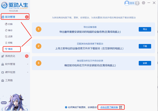 点击上方下载按钮安装打开“驱动人生”,在“驱动管理”栏目下找到“离线”功能,按照操作即可完成。