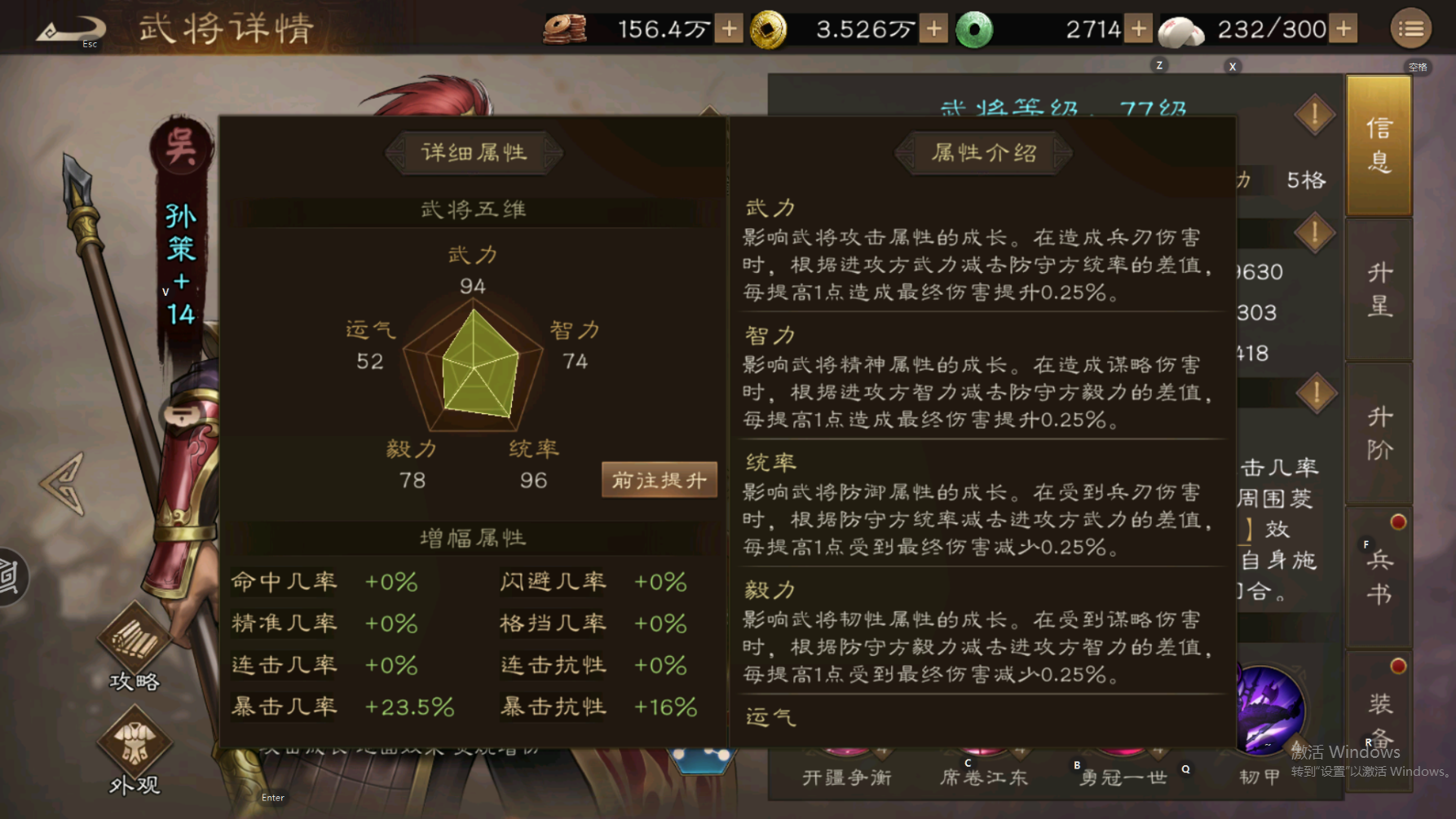 从五维看,孙策的武力属于T1级别,智力属于良好级别,统率决定防御属于T0级别,毅力决定法术防御属于良好级别,运气决定暴击一般;